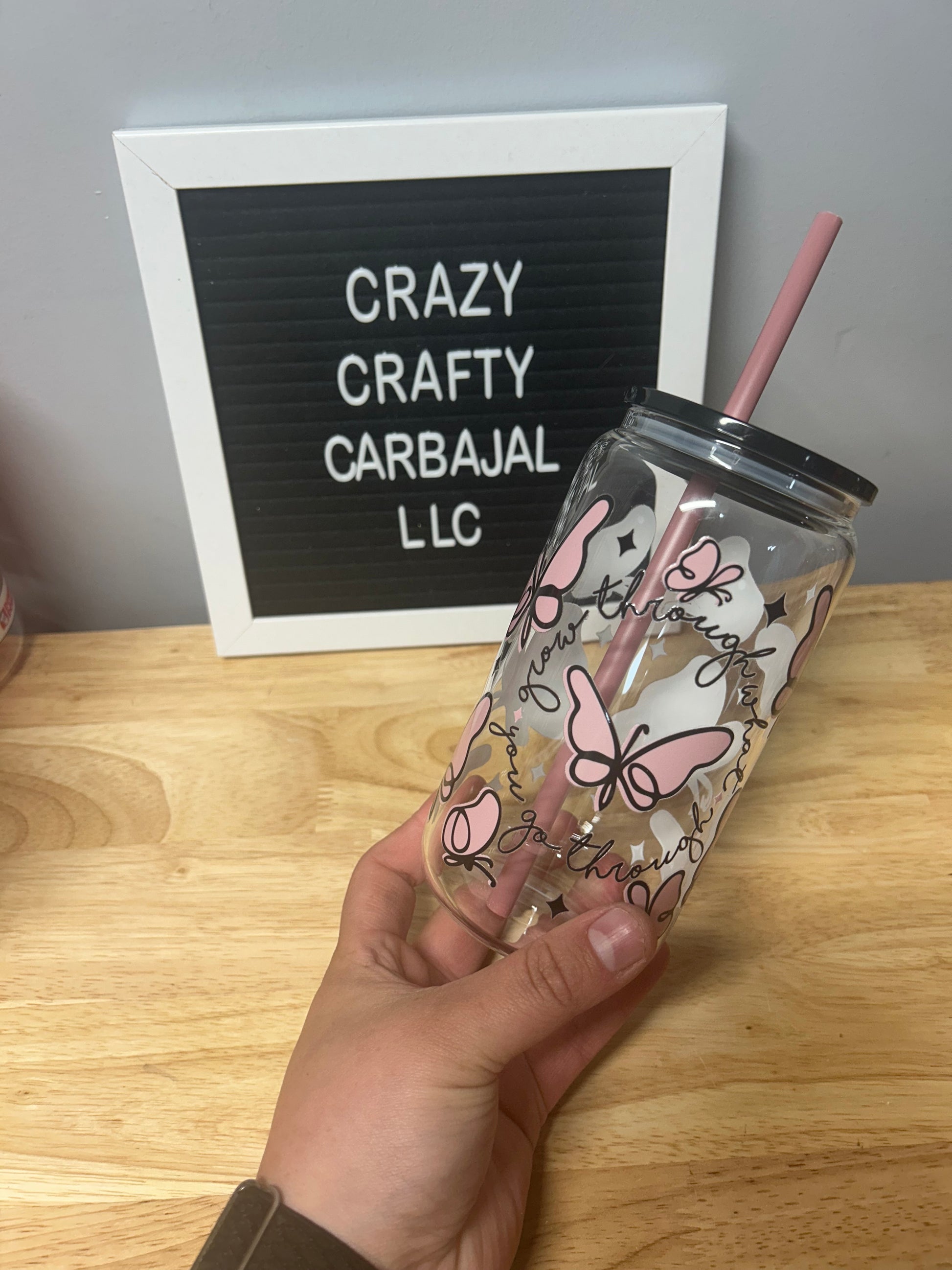 This 16oz Libby glass cup features a Uv DTF wrap design with the inspiring message "GROW THROUGH WHAT YOU GO THROUGH."